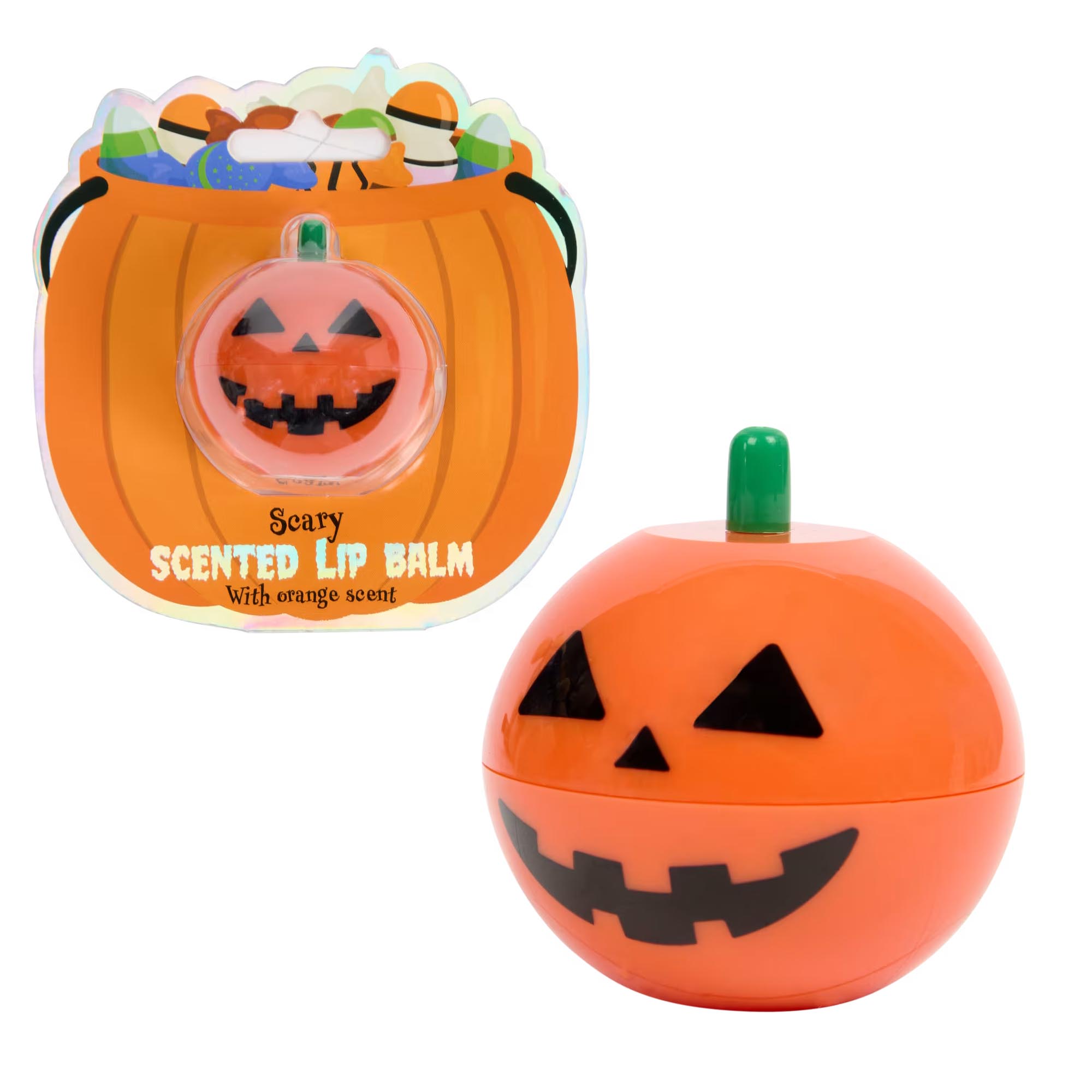 Divertido bálsamo de labios con aroma a naranja inspirado en Halloween con forma de calabaza.
