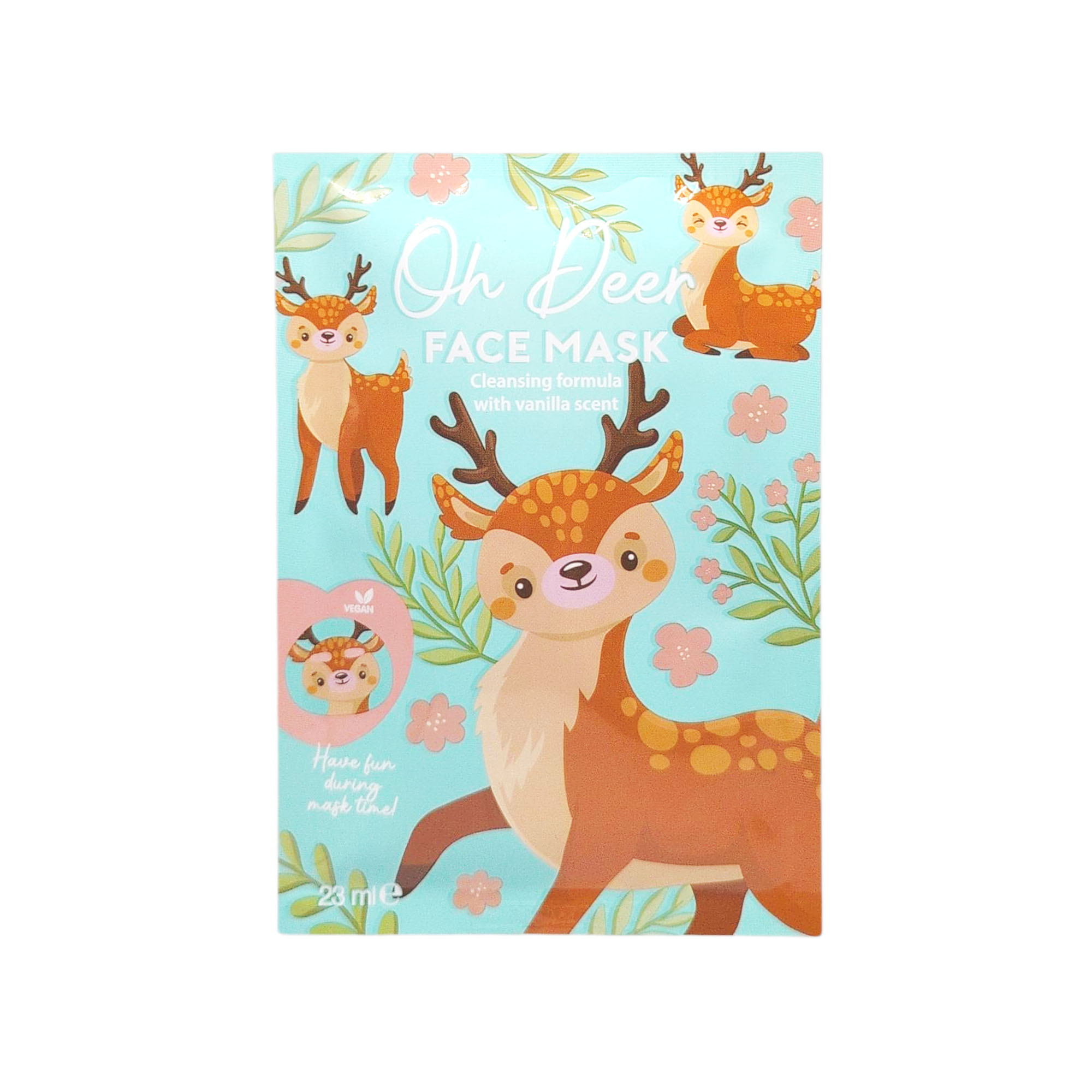 Mascarilla facial hidratante con extracto de vainilla, con divertido diseño de un ciervo.