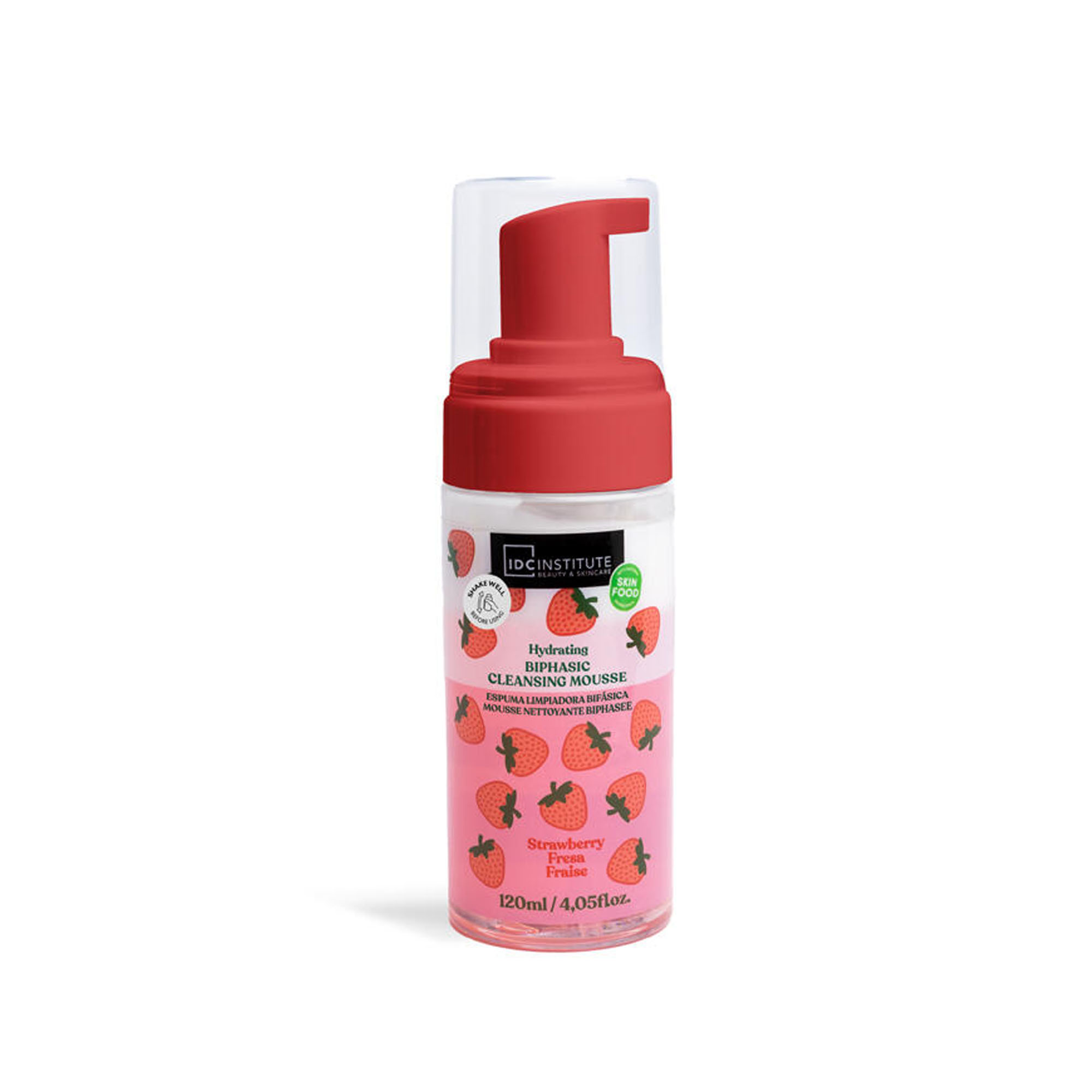 Mousse Limpiador Facial Bifásico de fresa con propiedades nutritivas e hidratantes, que dejan la piel limpia, suave, fresca y radiante.
