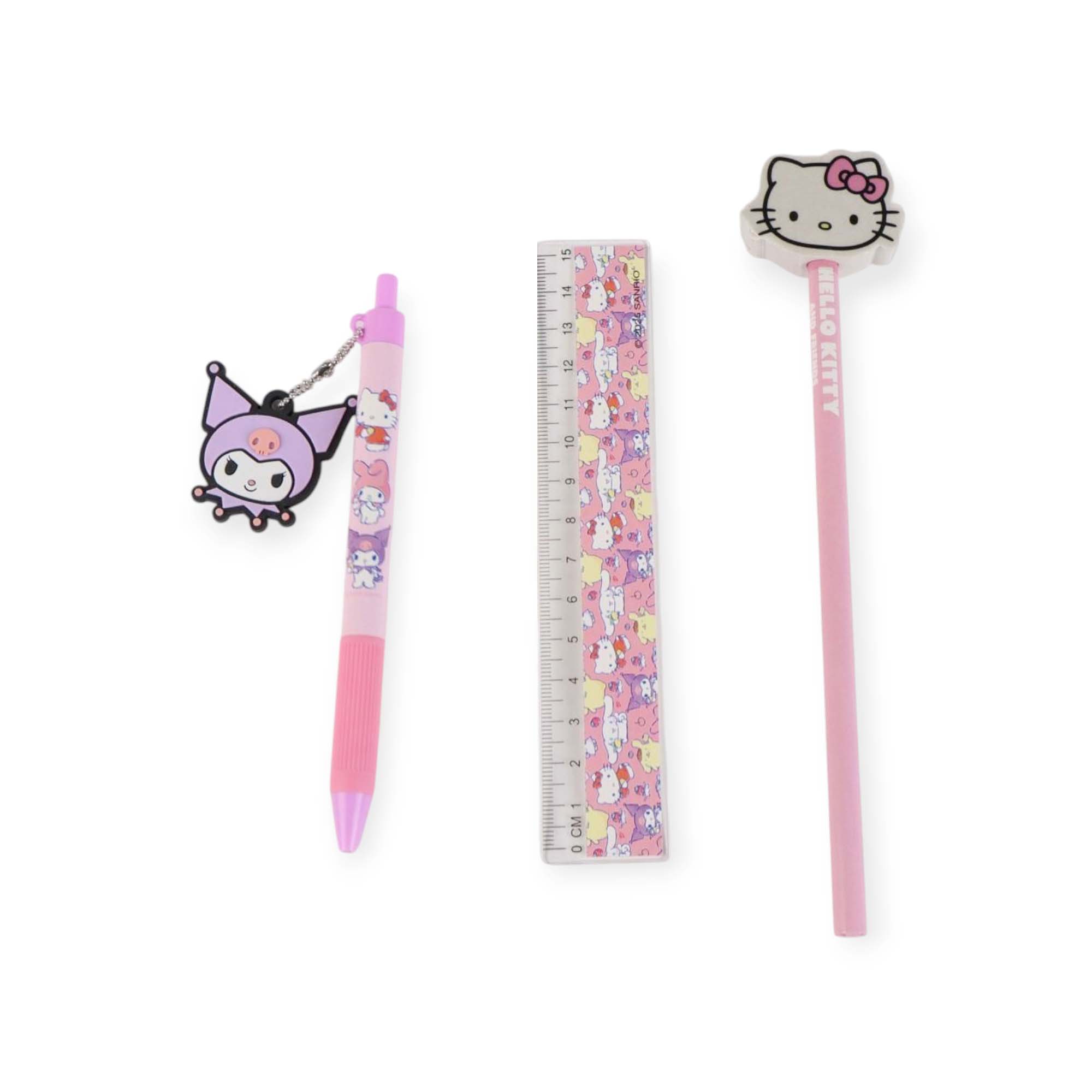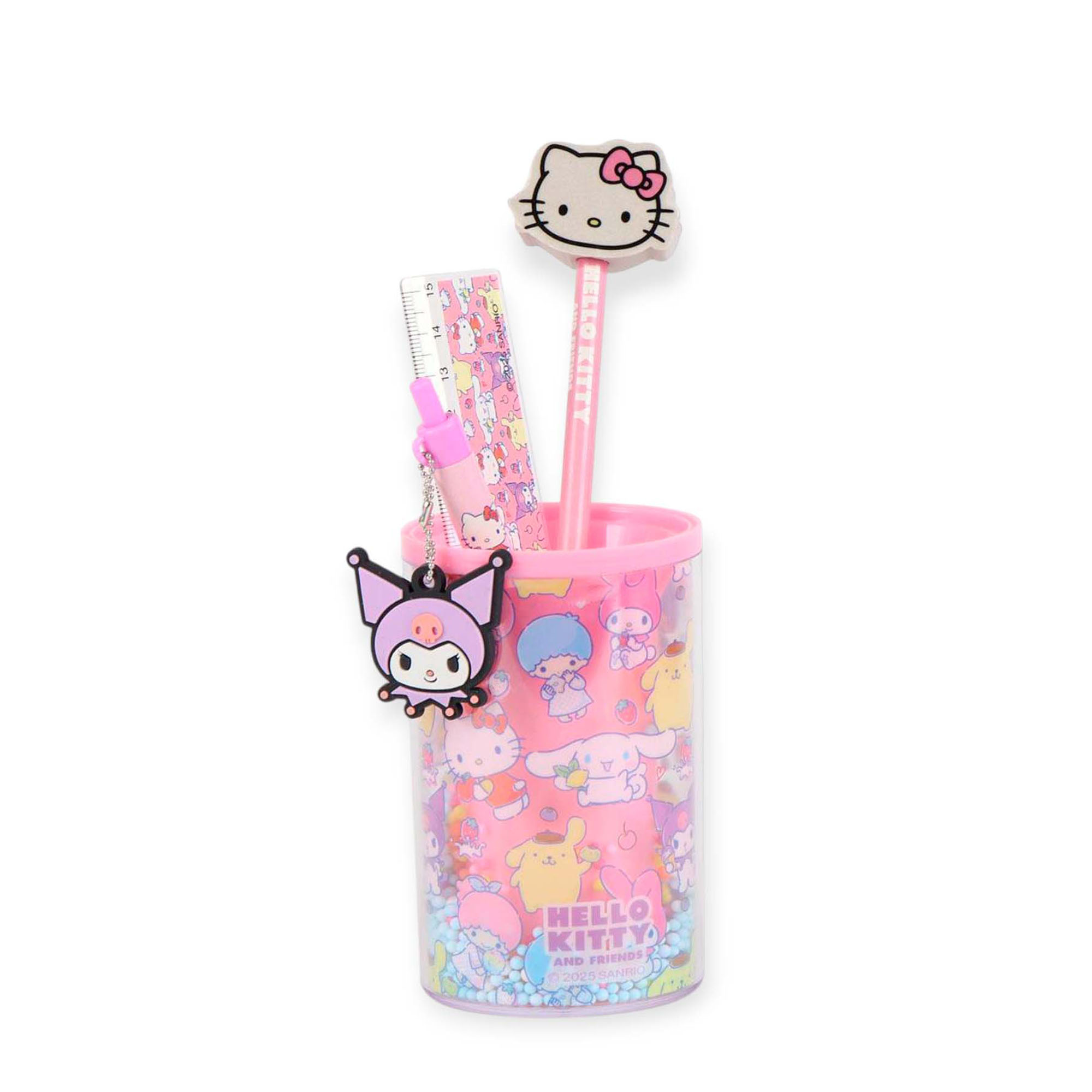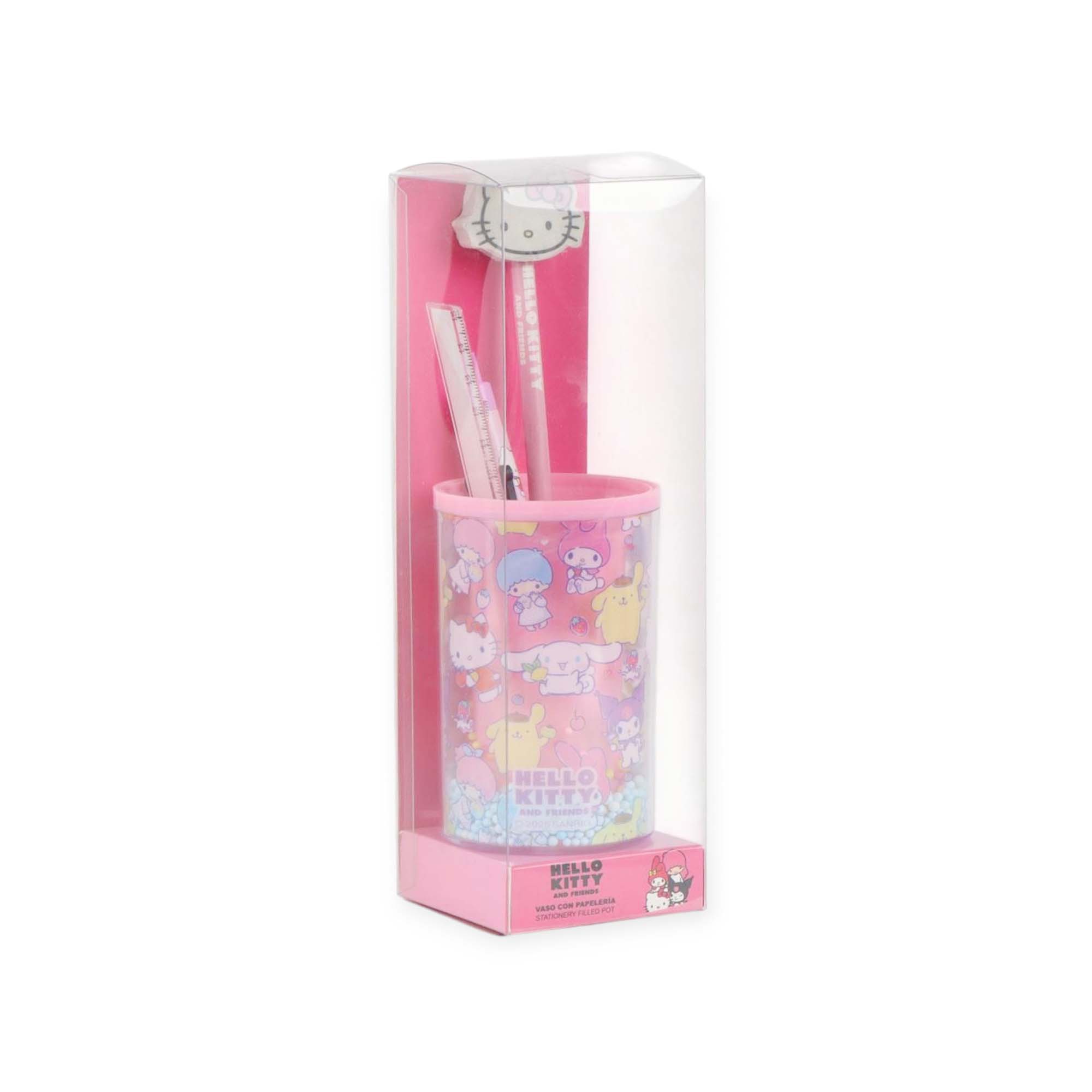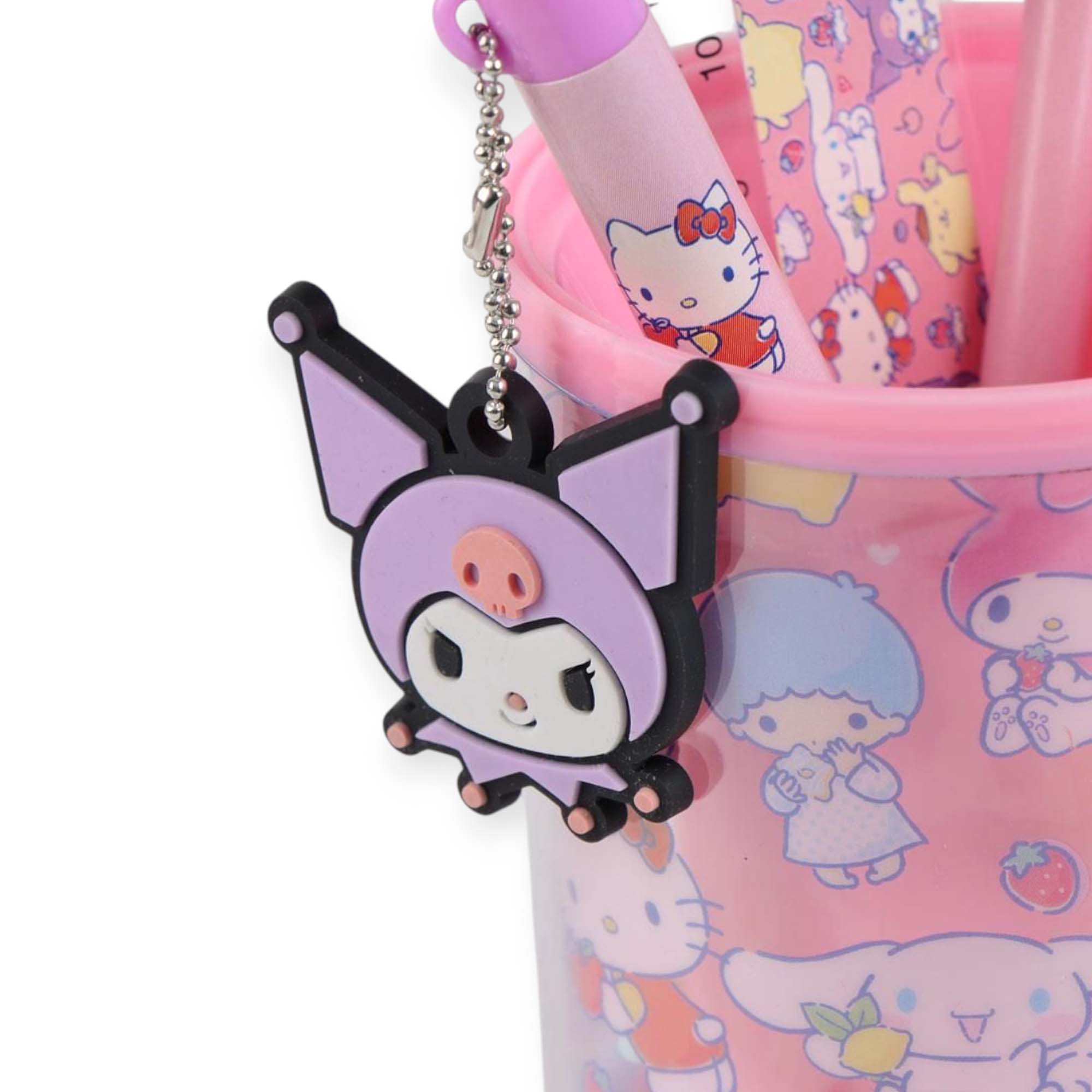 Precioso set de papelería de Hello Kitty que un colorido portalápices decorado con imágenes de Hello Kitty, Kuromi entre otros, acompañado de una regla, un bolígrafo y un lápiz a juego.